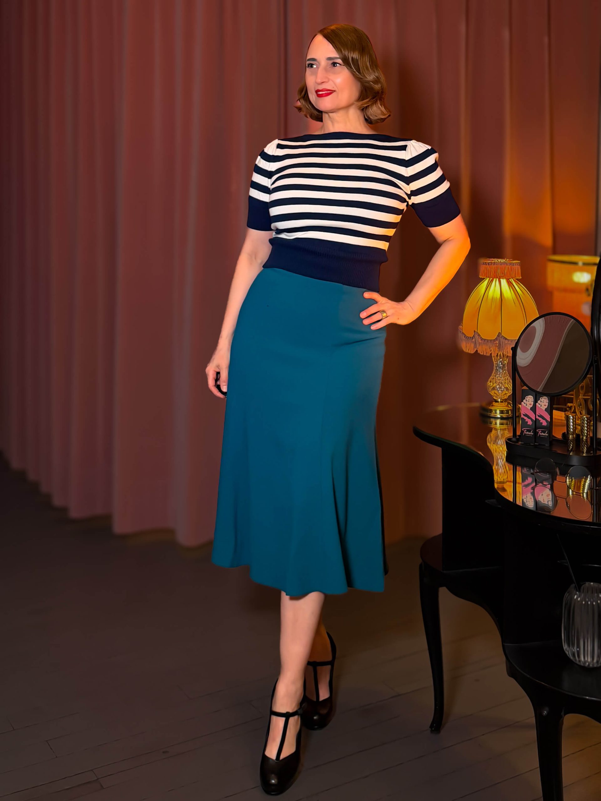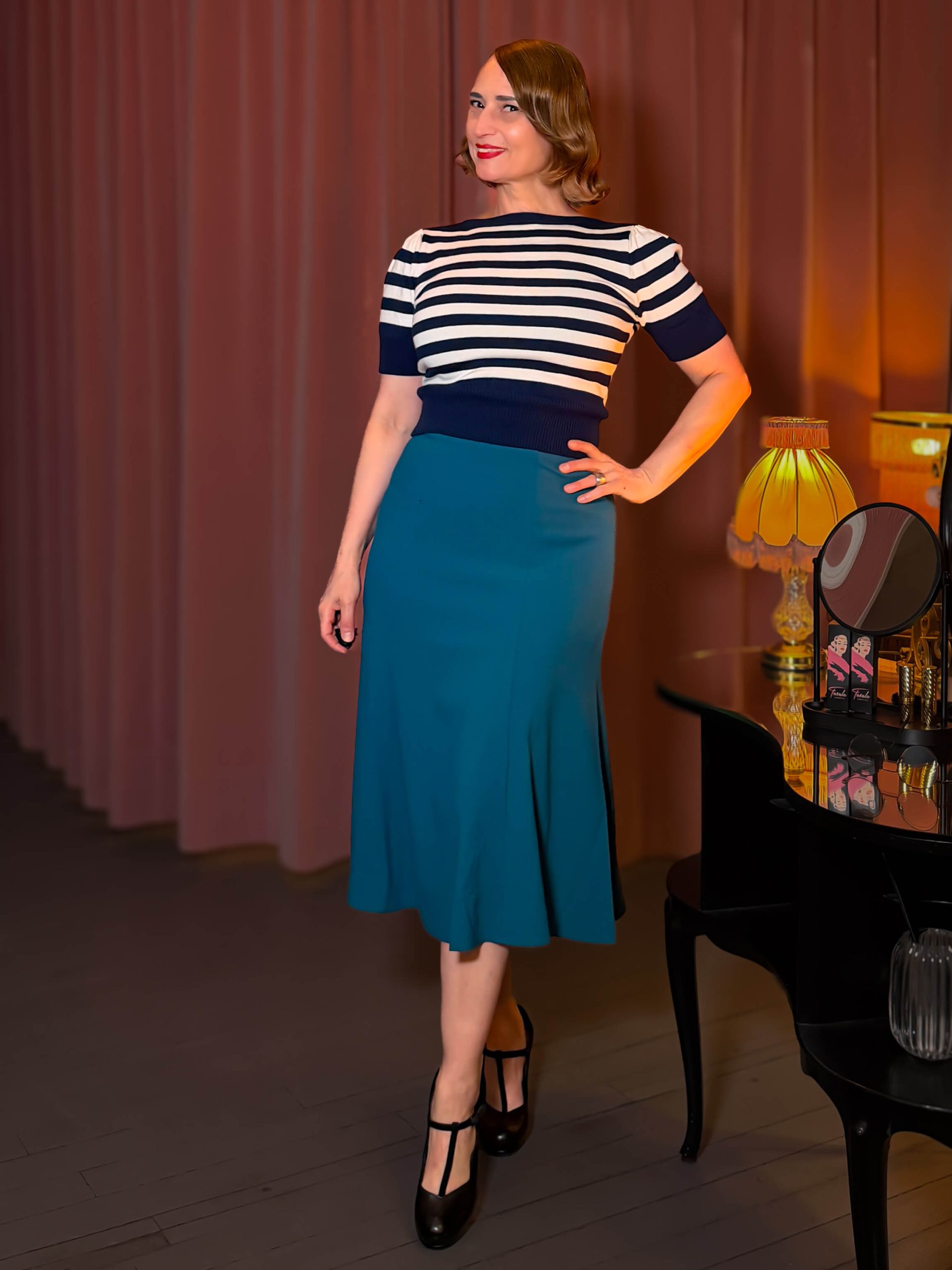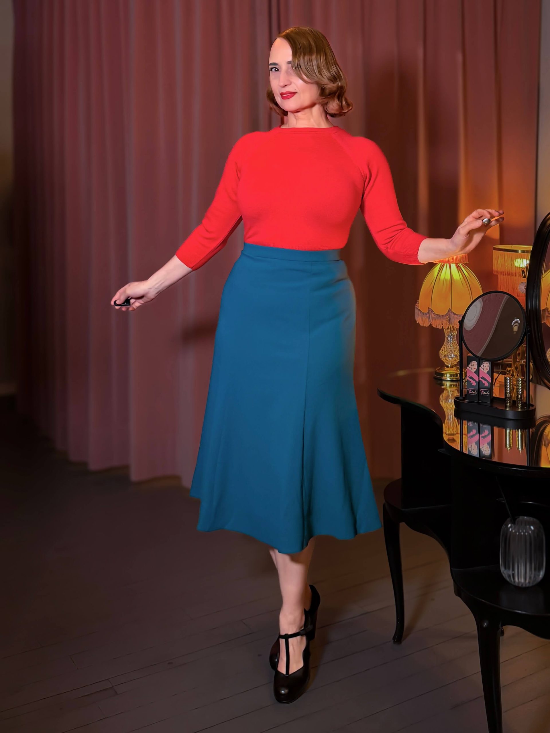 Der Midirock Bette ist von den glamourösen 1930er-Jahren inspiriert. Er ist ein superfeminines und dennoch praktisches Kleidungsstück für die moderne Frau – egal ob im Büro oder beim Ausgehen. Der Rock besteht aus einem wunderschönen, schweren Kreppstoff mit leichtem Stretch. Er liegt hüfthoch an und wird zum Saum hin leicht ausgestellt, wodurch er wunderschön fällt und eine wunderschöne, blütenblattartige Form erhält. Der Rock reicht bis knapp unter das Knie und sorgt so für eine einzigartige Vintage-Eleganz. Das halbgefütterte Design verhindert ein Anschmiegen an Bauch und Oberschenkel und ermöglicht so jede Bewegung. Dank des einfachen Reißverschlusses mit Knopf gehen Stil und Funktionalität Hand in Hand. Dieser klassische Rock ist eine atemberaubende Ergänzung für deine Garderobe.