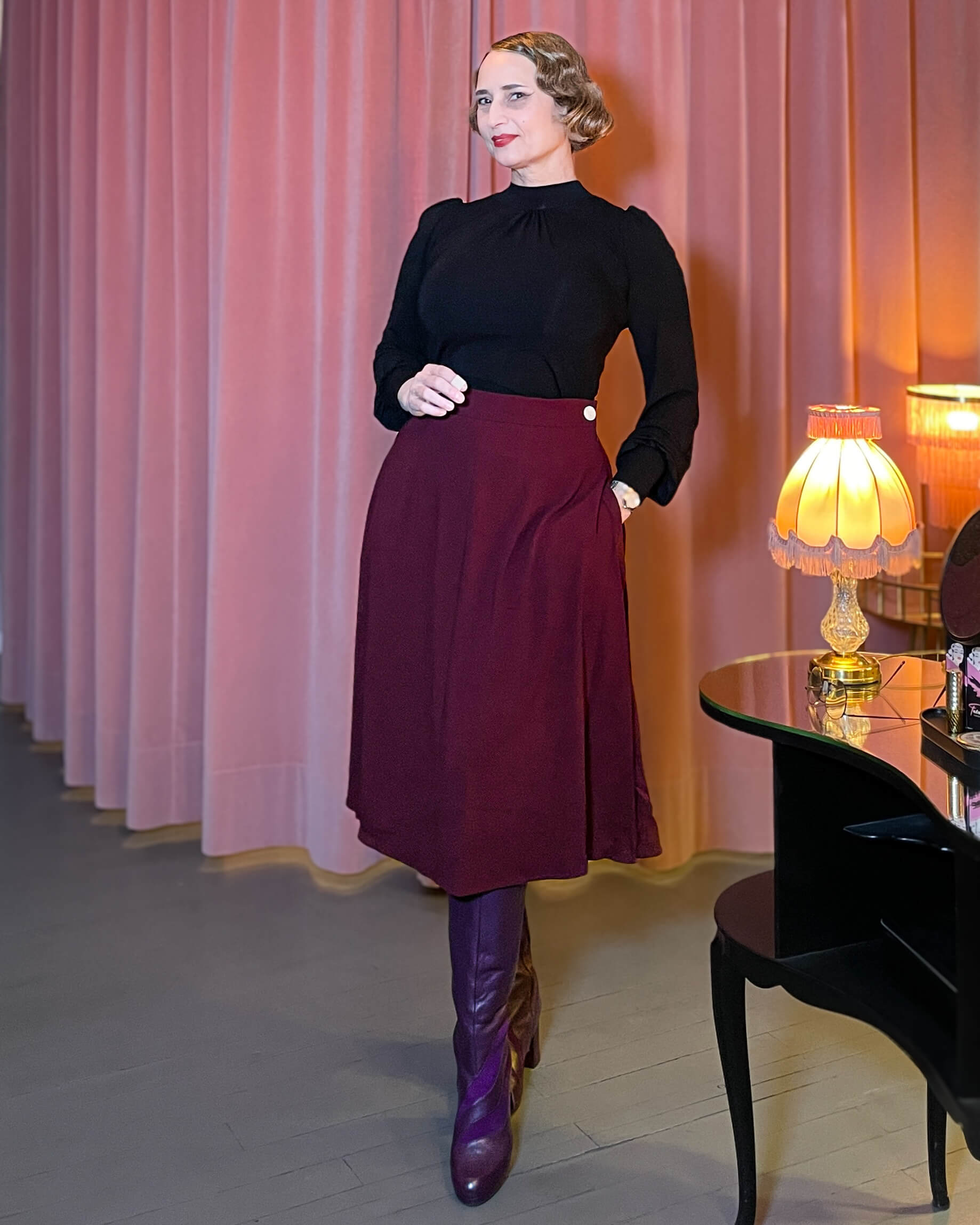 Dieser klassische weite Rock ist inspiriert von den 1940er und 50er Jahren. Dieses raffinierte und feminine Modell aus der Ära der klassischer Silhouetten und des Glamours der 40er Jahre, versetzt dich leicht die Vergangenheit und verleiht dir das gewisse Etwas in der Gegenwart. Die wunderschön fließende Form schmeichelte der Trägerin und kreiert eine wohlproportionierte Sanduhrfigur. Der Stoff ist praktisch und strapazierfähig und hat einen schönen Fall sowie perfekte Bewegungsfreiheit. Praktisch sind auch die beiden Seitentaschen. Dazu passen Blusen aller Art sowie eng anliegende Tops, welche die weiblichen Proportionen noch weiter unterstreichen.
