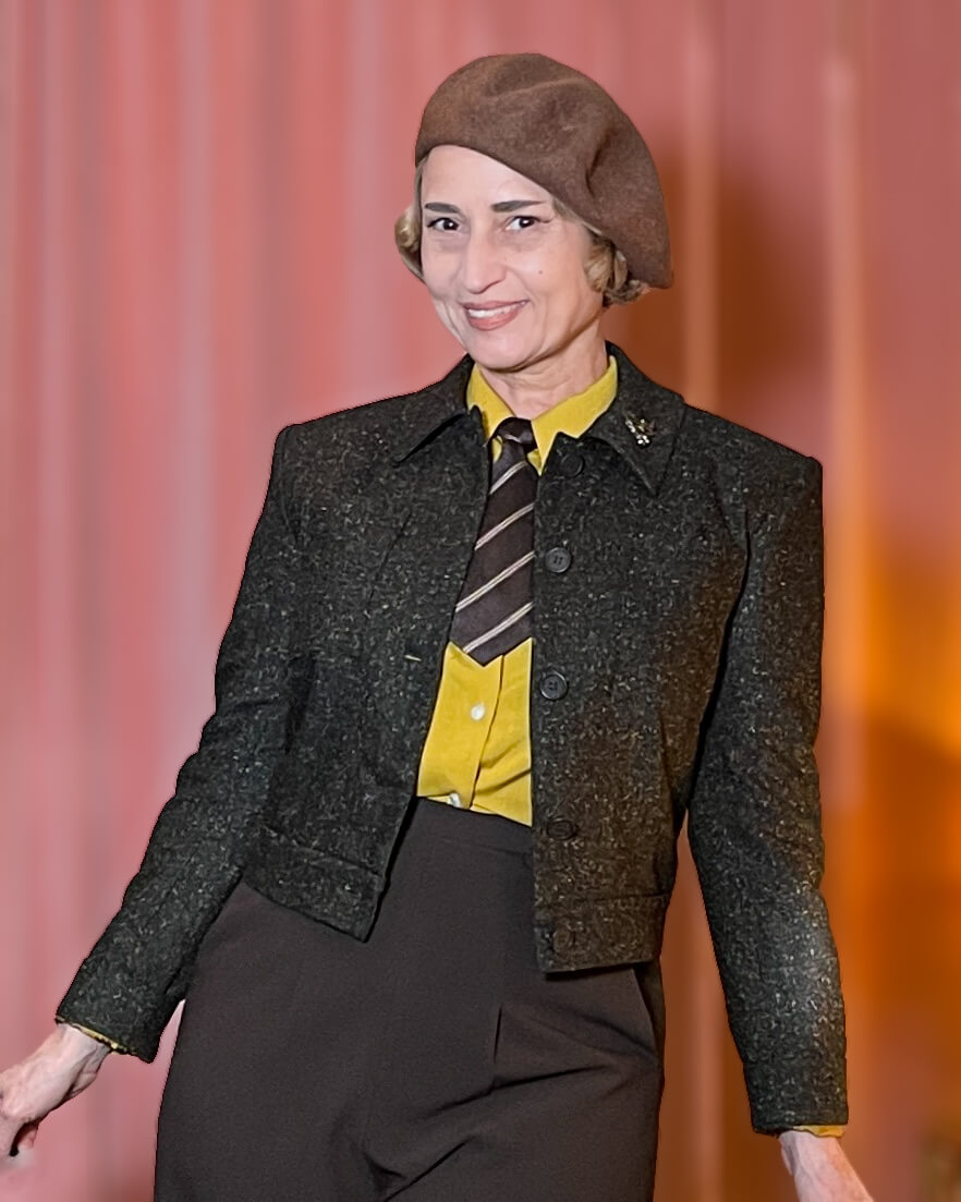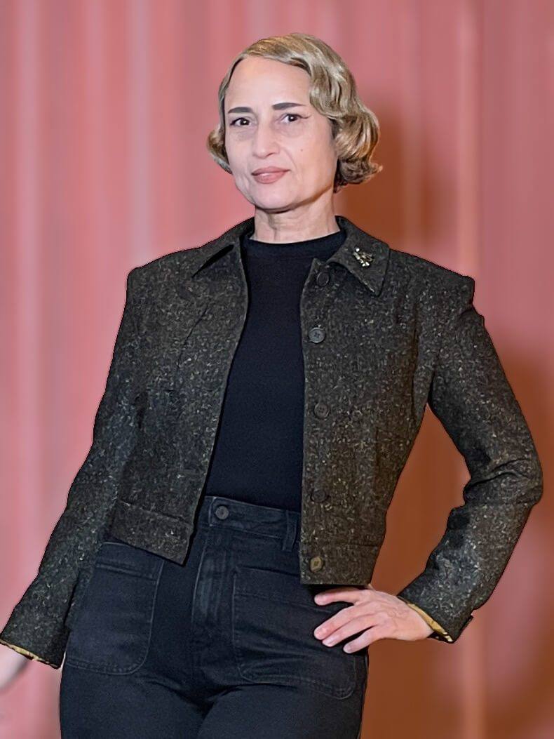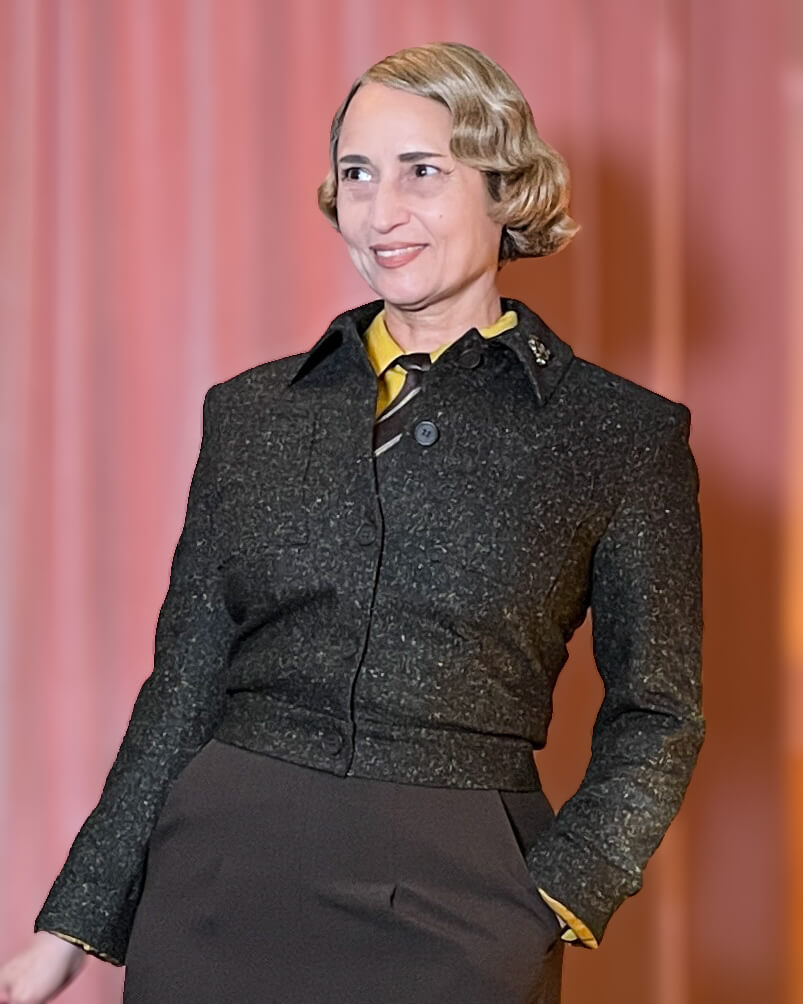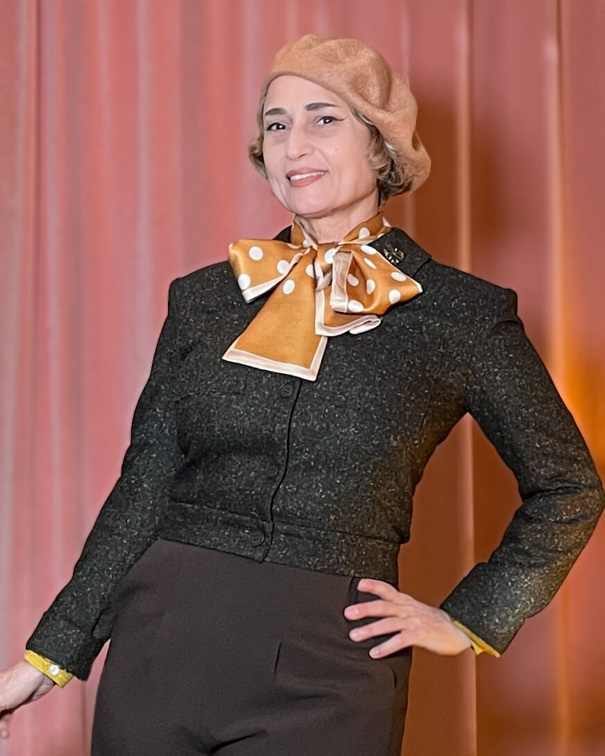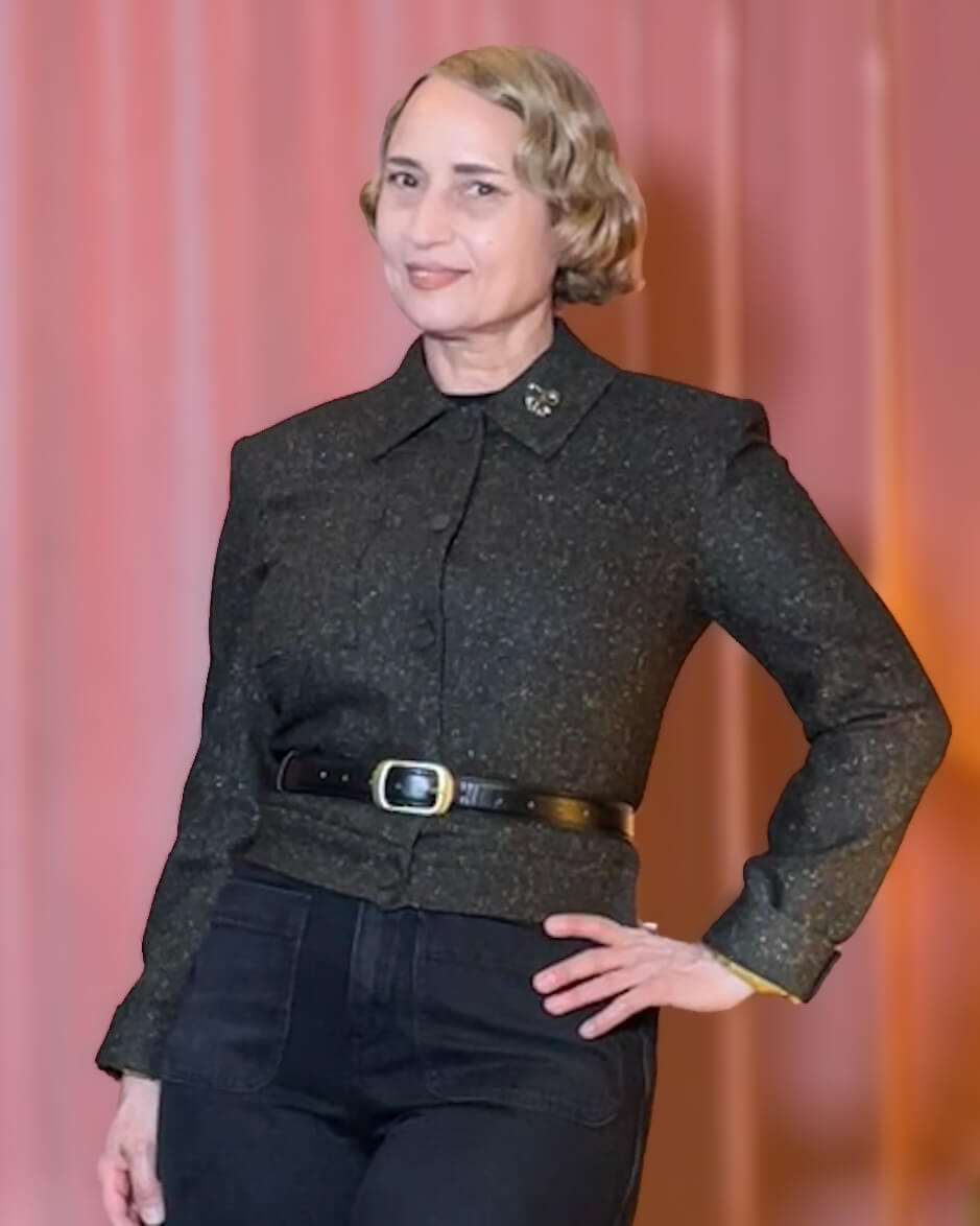 Elegante, taillierte Jacke mit Umlagekragen und Manschetten im Stil der 40er Jahre. Entdecke diese stilvolle, taillenkurze Jacke, die mit ihrem zeitlosen Design und der hochwertigen Verarbeitung überzeugt. Aus braun-schwarz melierter Schurwolle gefertigt, ist sie das perfekte Kleidungsstück für jede modebewusste Frau, die den Charme der 40er Jahre schätzt.