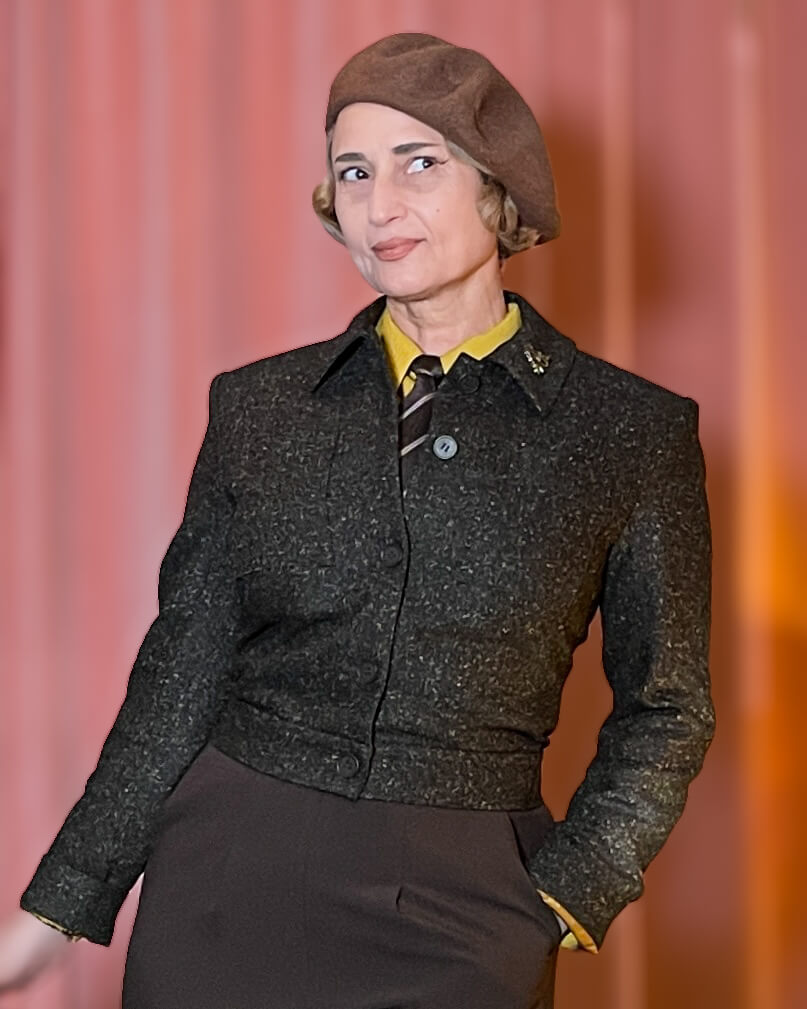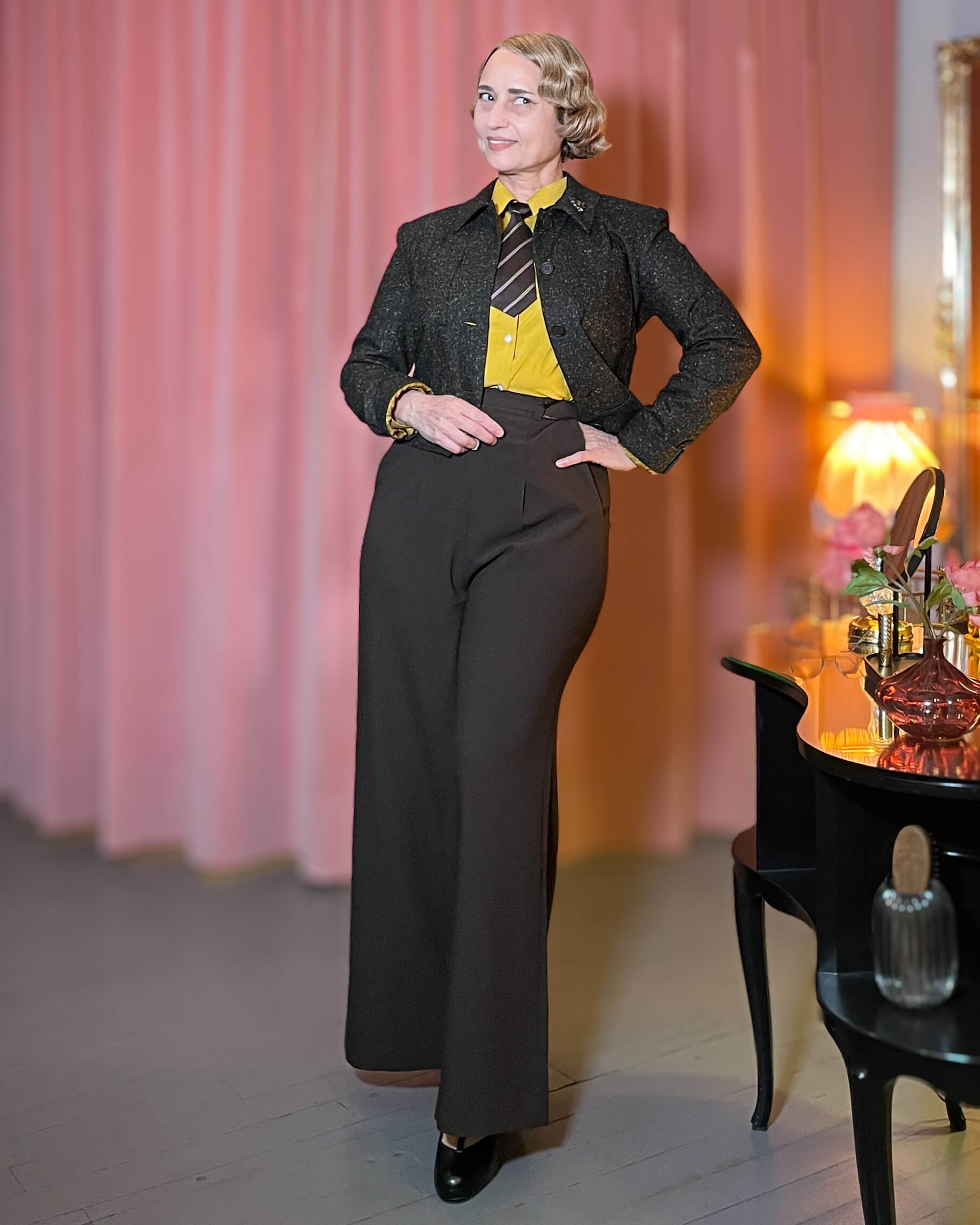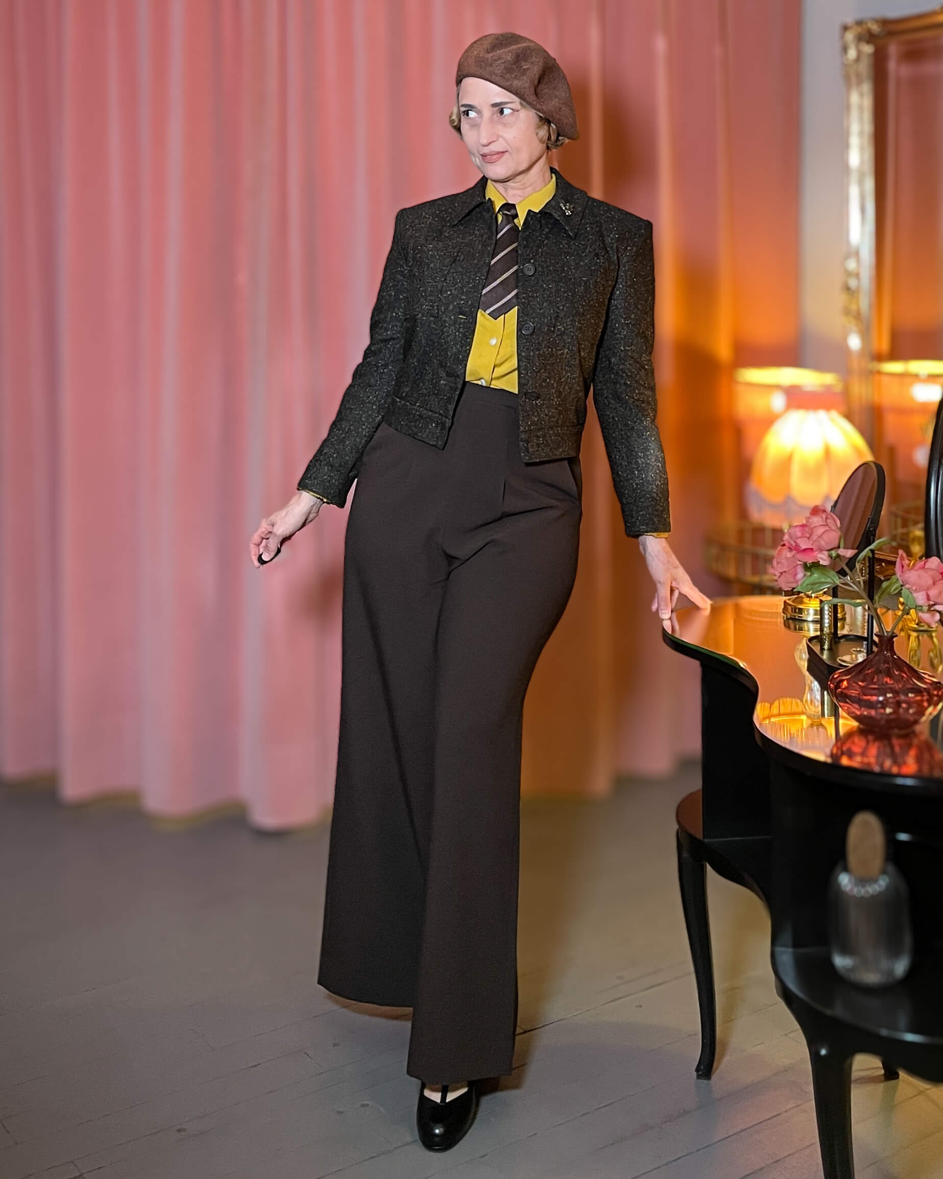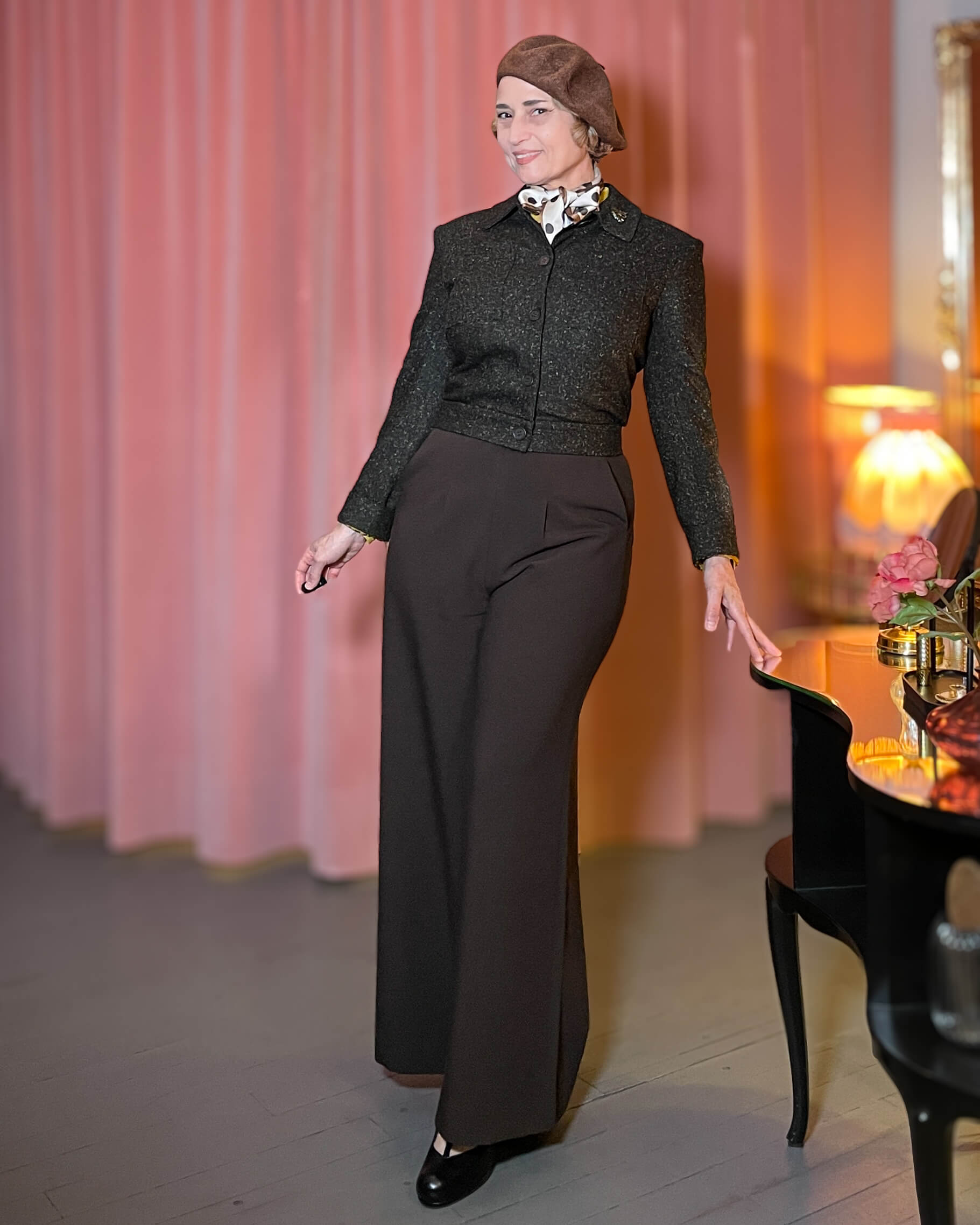 Schicke, kurze Jacke aus brauner Schurwolle im angesagten Vintage Stil der 40er Jahre. Perfekt kombiniert mit dem dazu passenden Rock Dolores.