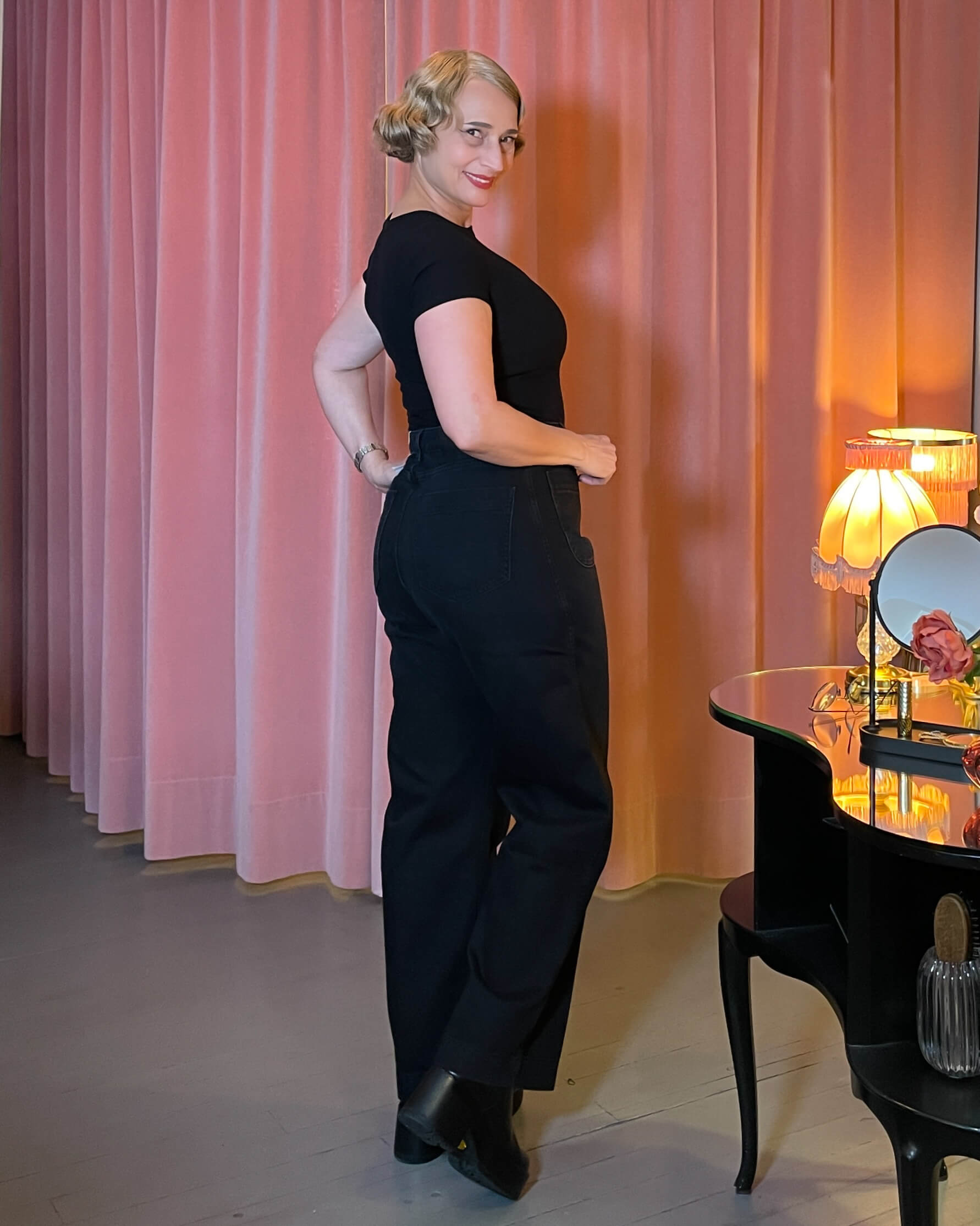 High Waist Pocket Jeans im Stil der 70er Jahre aus 100%iger weicher Baumwolle für einen hohen Tragekomfort über den ganzen Tag.