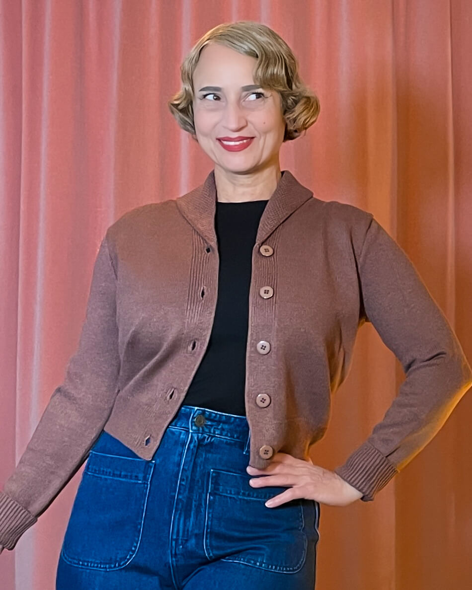 Vintage-inspirierter Cardigan mit elegantem Schalkragen und passenden Knöpfen. Mit bequemem Rippbündchen an Saum und Bündchen. Die perfekte Mischung aus 40er/50er-Jahre-Stil und moderner Kurz-Silhouette besonders passend zu hochtaillierten Röcken und Hosen.