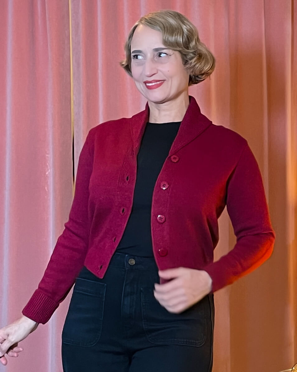 Wunderbare Strickjacke im klassischen Vintage Stil der 40er bis 50er Jahre mit Kragen und passender Länge für hochtaillierte Hosen und Röcke.