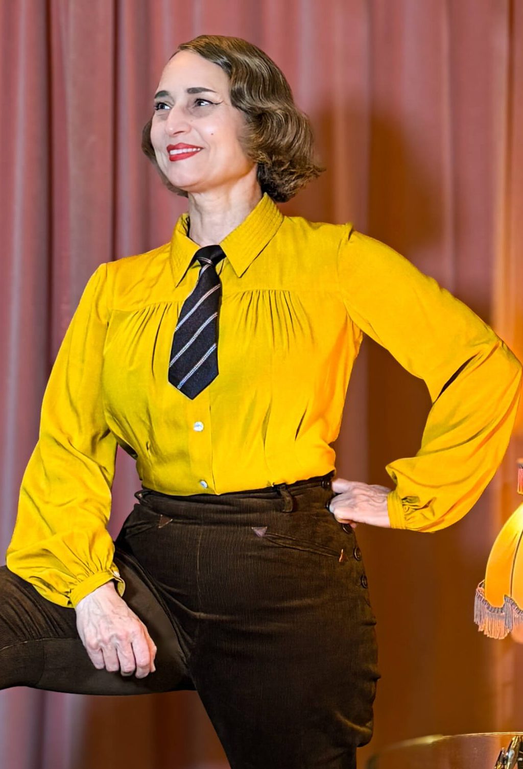Die Bluse Greta Langarm – gelb ist der wahrgewordene Blusentraum. So zart, so feminin, so vielseitig, so edel und so unglaublich angenehm zu tragen. Die schwarze Satinschleife kann zu einer Art Fliege gebunden oder alternativ auch ganz entfernt werden. Ich persönlich mache am liebsten den obersten Knopf zu und trage sie mit einer Krawatte. Die kräftige gelbe Farbe ist eher ein Senf Gelb und lässt sich richtig gut mit vielem kombinieren.
