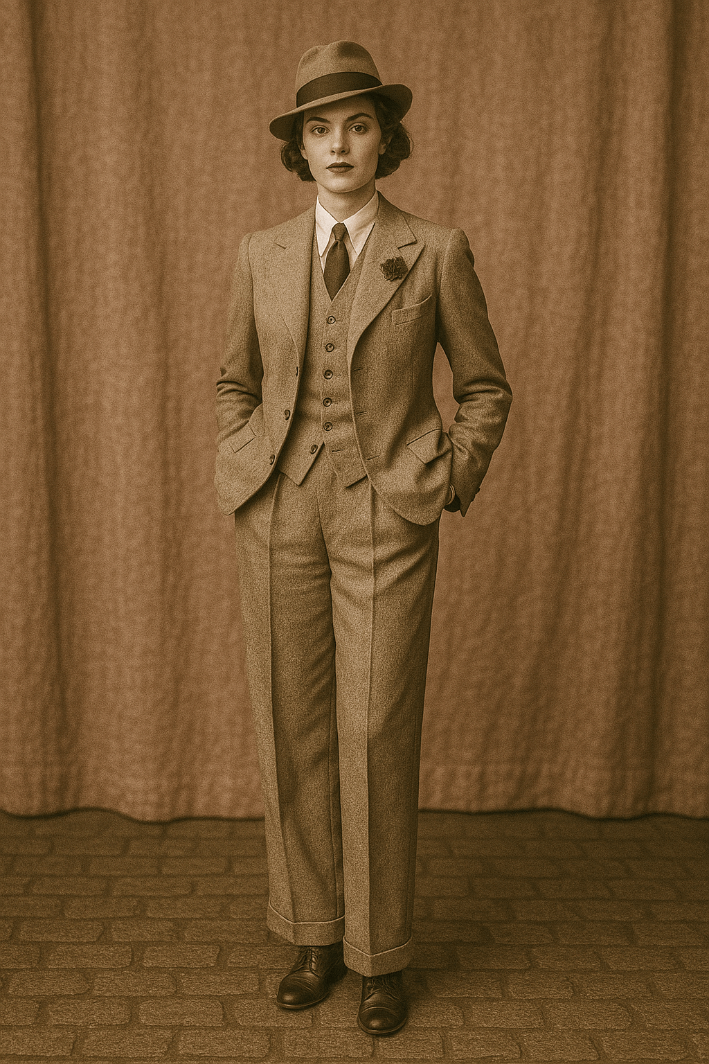 Der Marlene-Dietrich-Look greift maskuline Elemente auf: weite Marlenehosen mit Bundfalten, Hosenanzug, Weste und Blazer, dazu Hemd oder Bluse. Der Schnitt bleibt elegant und taillenbetont, wirkt aber geradliniger und androgyn als das Charlestonkleid. Mit Hut, Krawatte oder Fliege und roten Lippen entsteht ein sehr selbstbewusster, fast filmischer 20er-Jahre-Look.