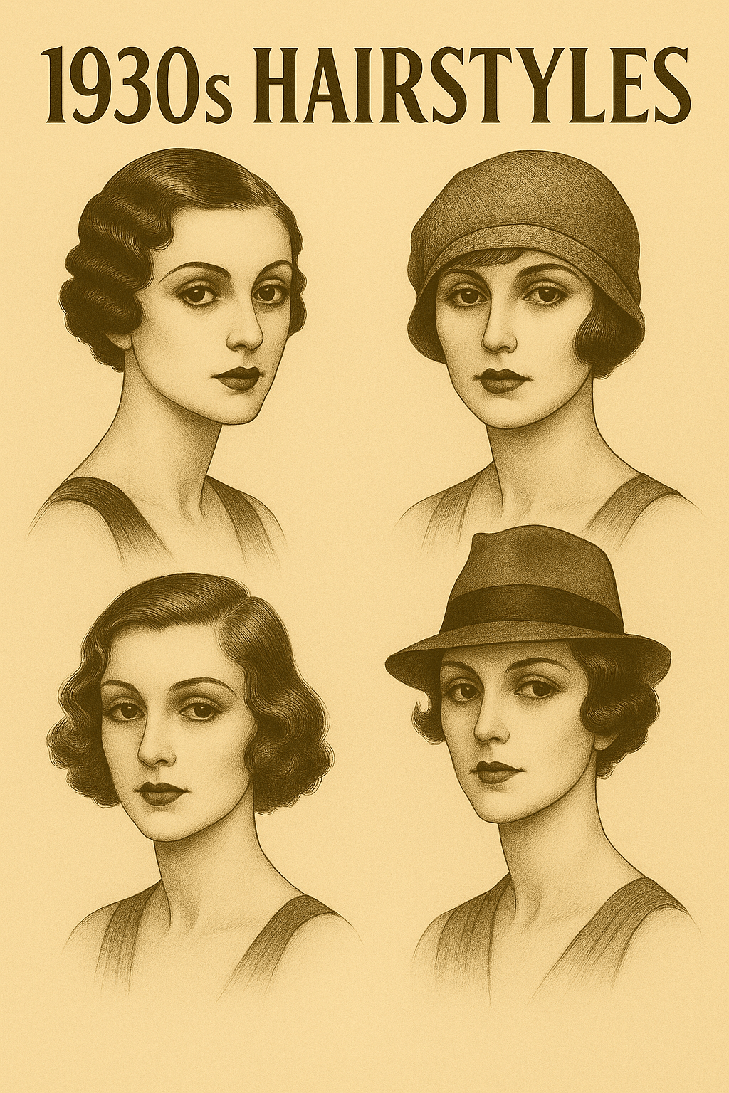 Fingerwellen: Weiche, glänzende Wellen lagen nah am Kopf an – glamourös und filigran. Seitenscheitel: Meist streng zur Seite gekämmt, oft mit tiefem Seitenscheitel. Bob mit Länge: Im Gegensatz zum kurzen 20er-Bob wurde das Haar wieder etwas länger getragen, meist kinn- bis schulterlang. Hochgesteckt: Für den Abend waren elegante Chignons, Rollfrisuren oder Bananenrollen typisch. Accessoires: Dezente Haarnadeln, Haarreifen oder kleine Fascinators.